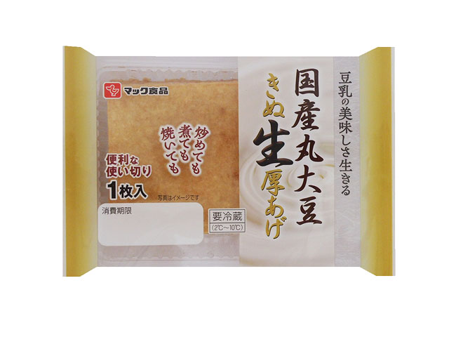 ほんのり甘い国産丸大豆を使用し、こだわりの製法で寄せた絹豆腐本来のなめらかさが味わえるきぬ「生」厚あげです。そのまま焼いてパリッと香ばしく、煮物や炒め物にもおいしい万能食材です。使い切りに便利な1枚入です。